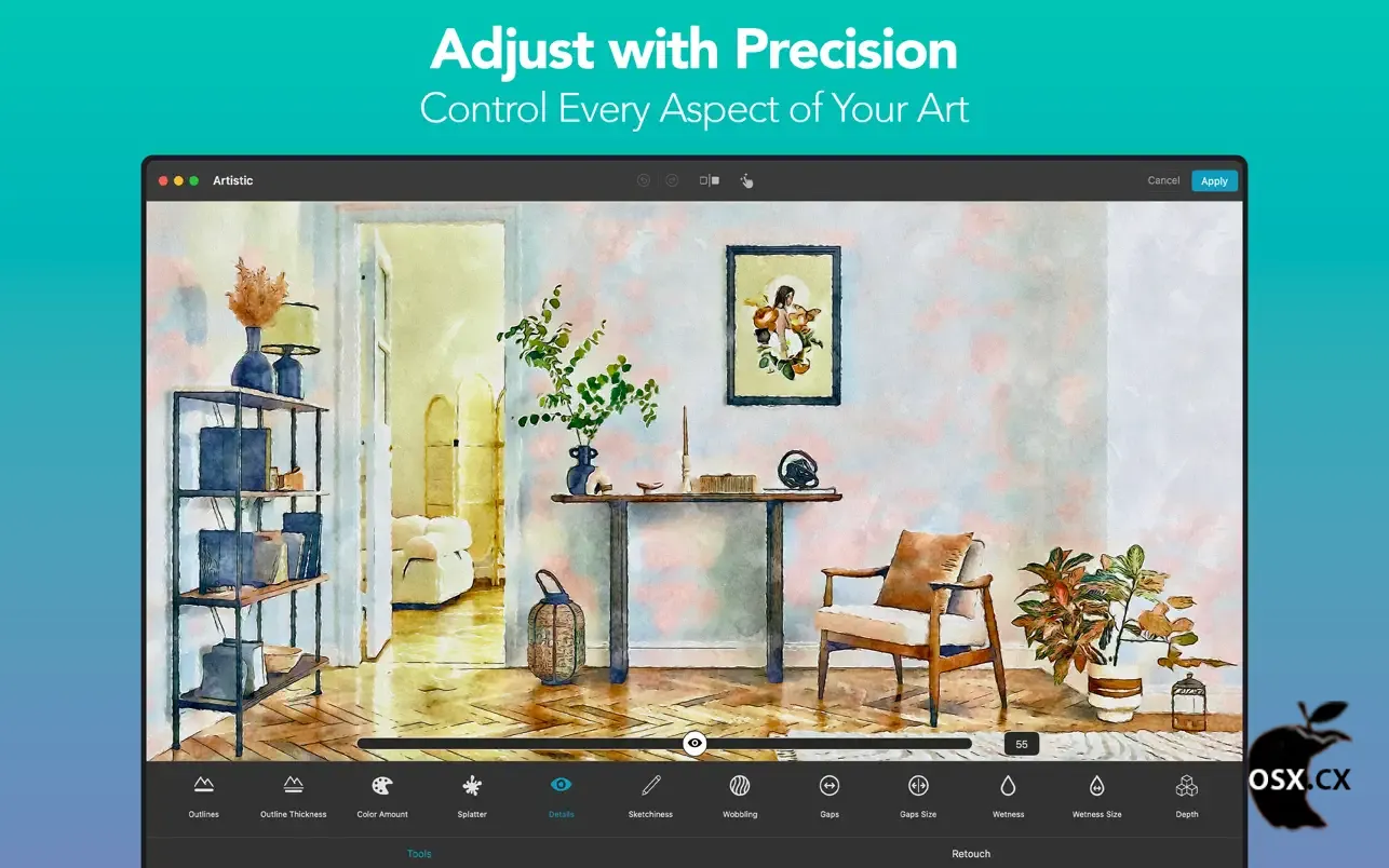 - 像素级修饰工具:支持使用手指或 Apple Pencil 进行精细 retouch 操作,包括添加或移除细节、轮廓、飞溅、间隙等,13 种专业工具让您像用画笔一样手工干预水彩效果。
